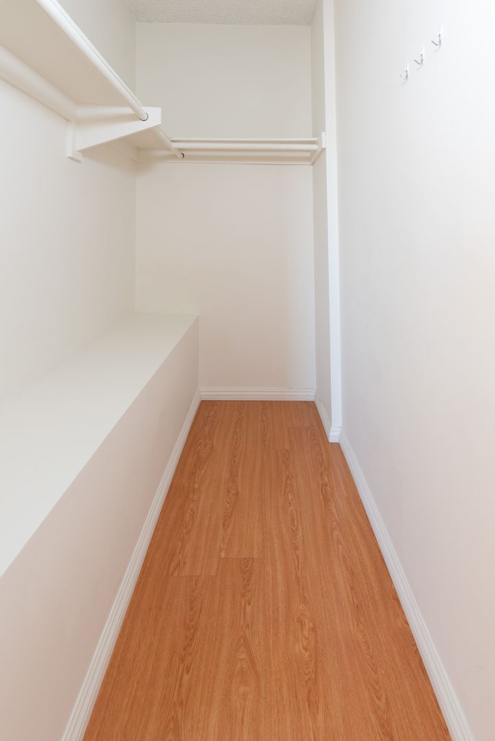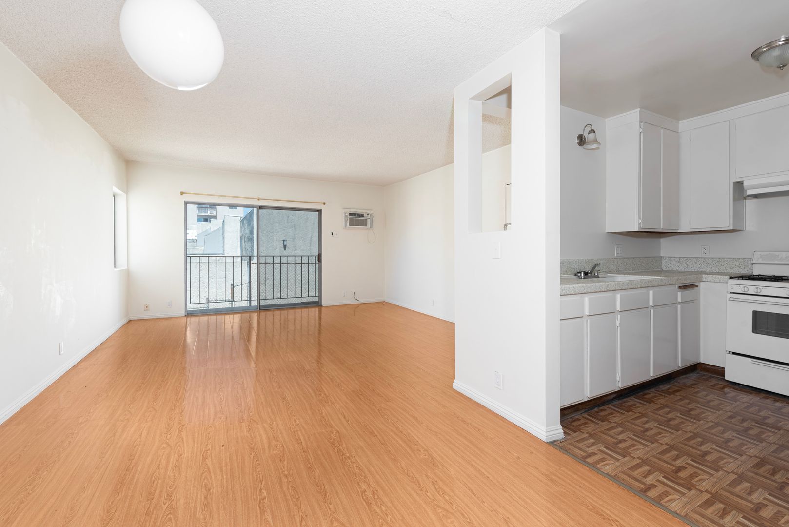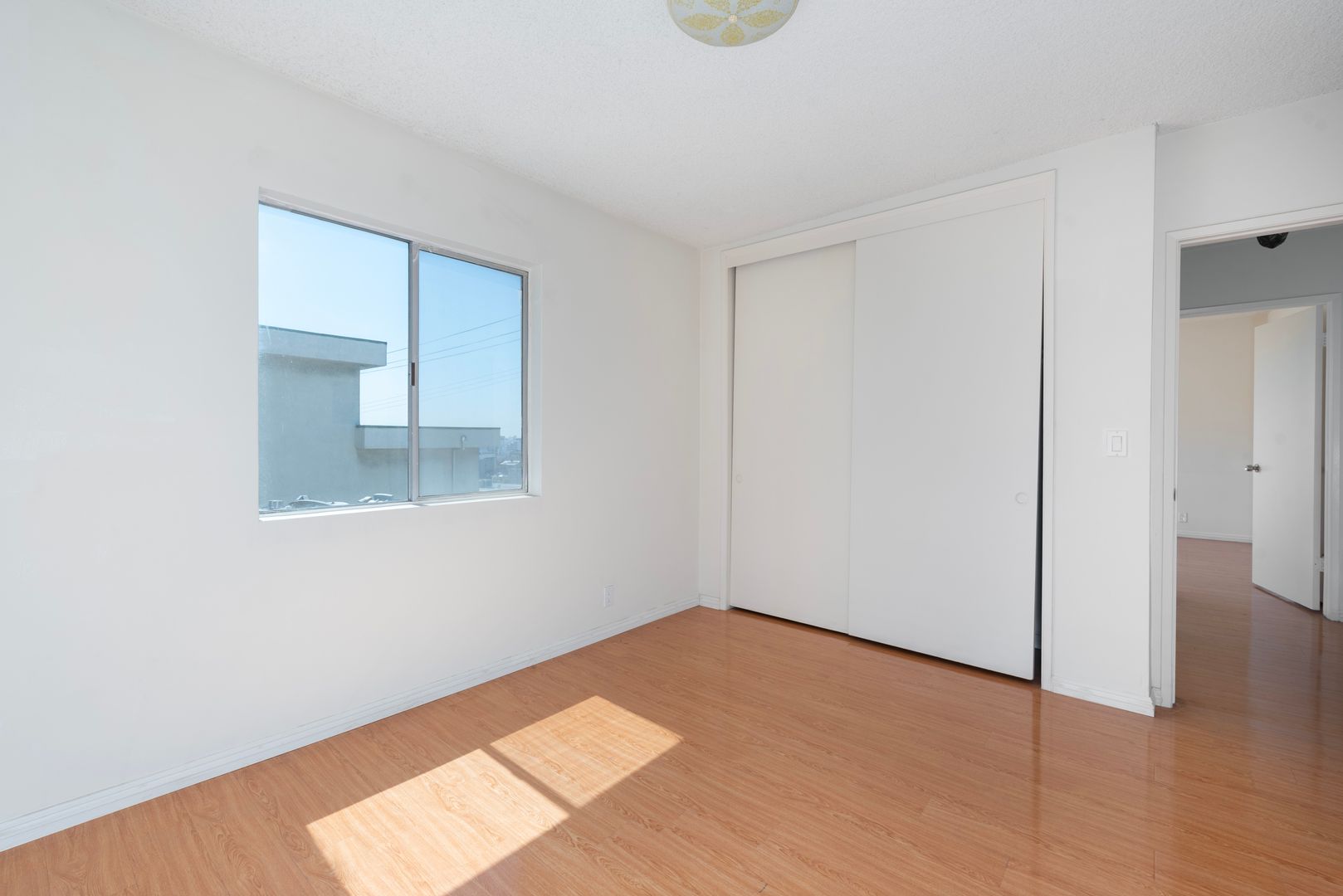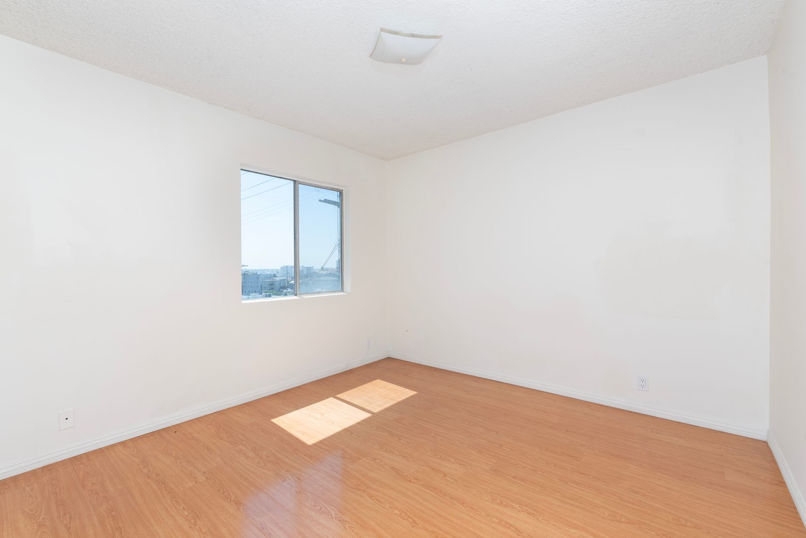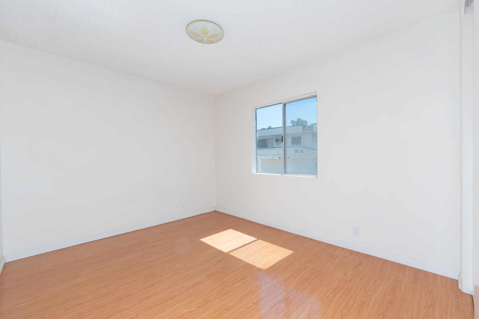 Spacious 2 bedroom 1 bath unit with a large patio space. Second floor unit with spacious living room and small balcony. Laminate flooring throughout. Rooms have plenty of natural light and views of downtown LA from the windows. Small 6 unit complex with secured parking garage. Wall unit AC. 1 secured parking space in garage.